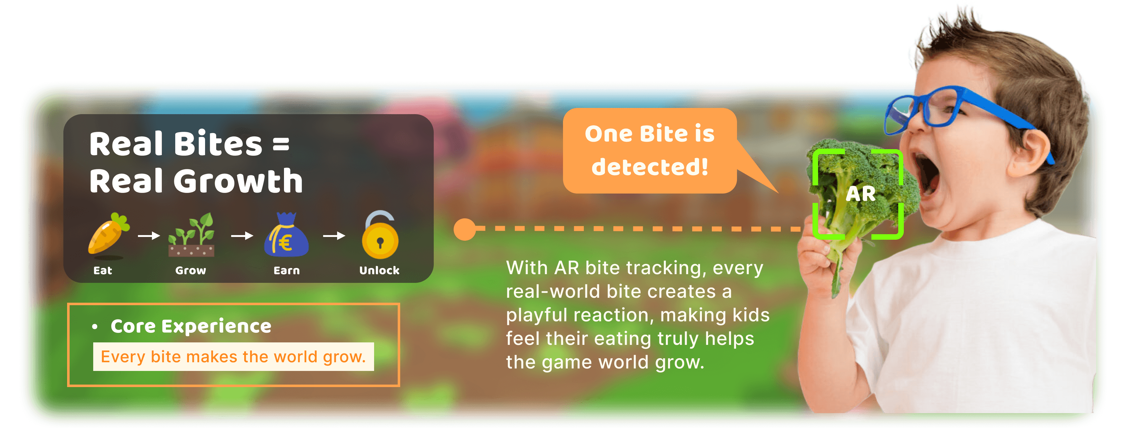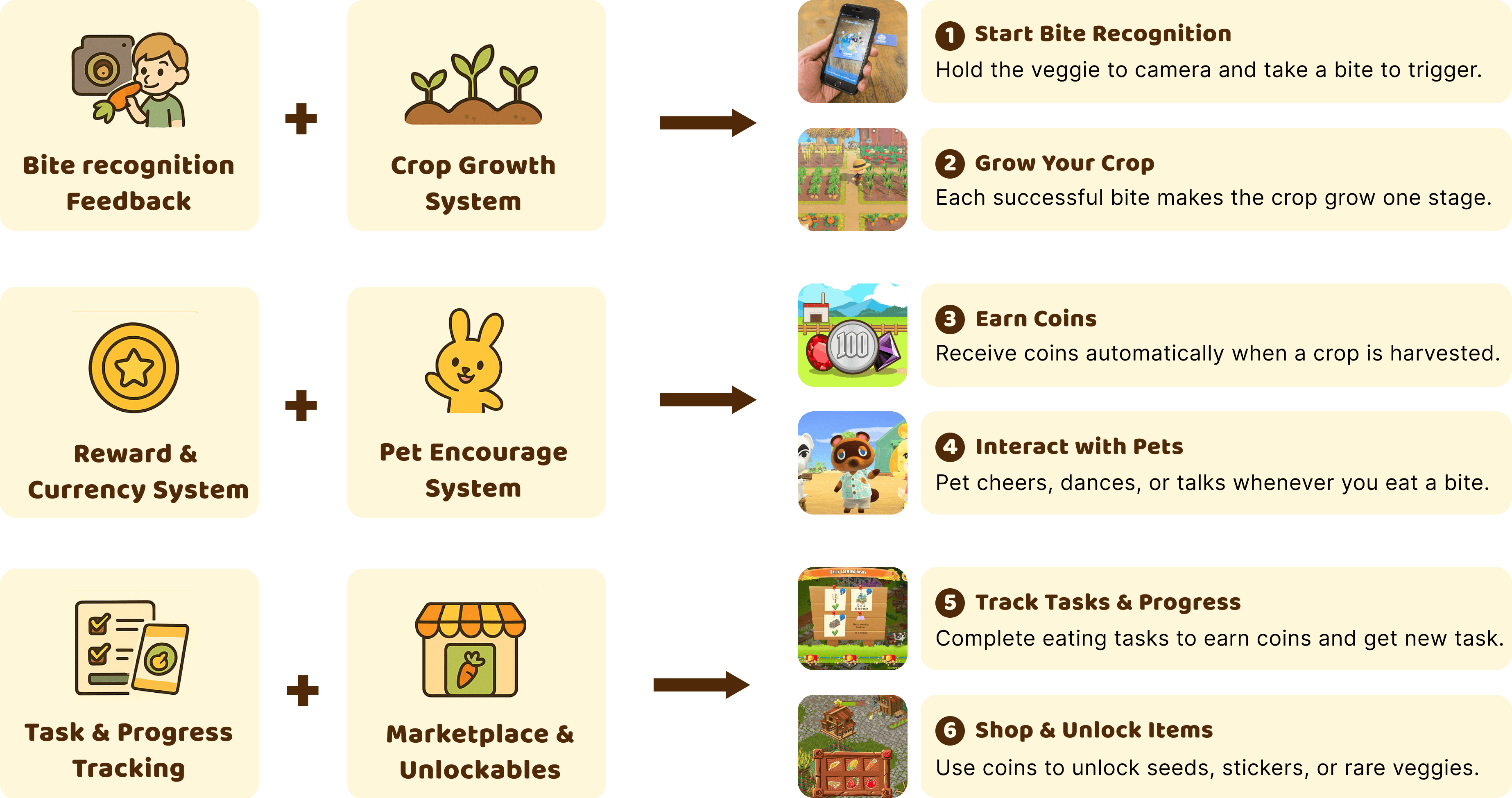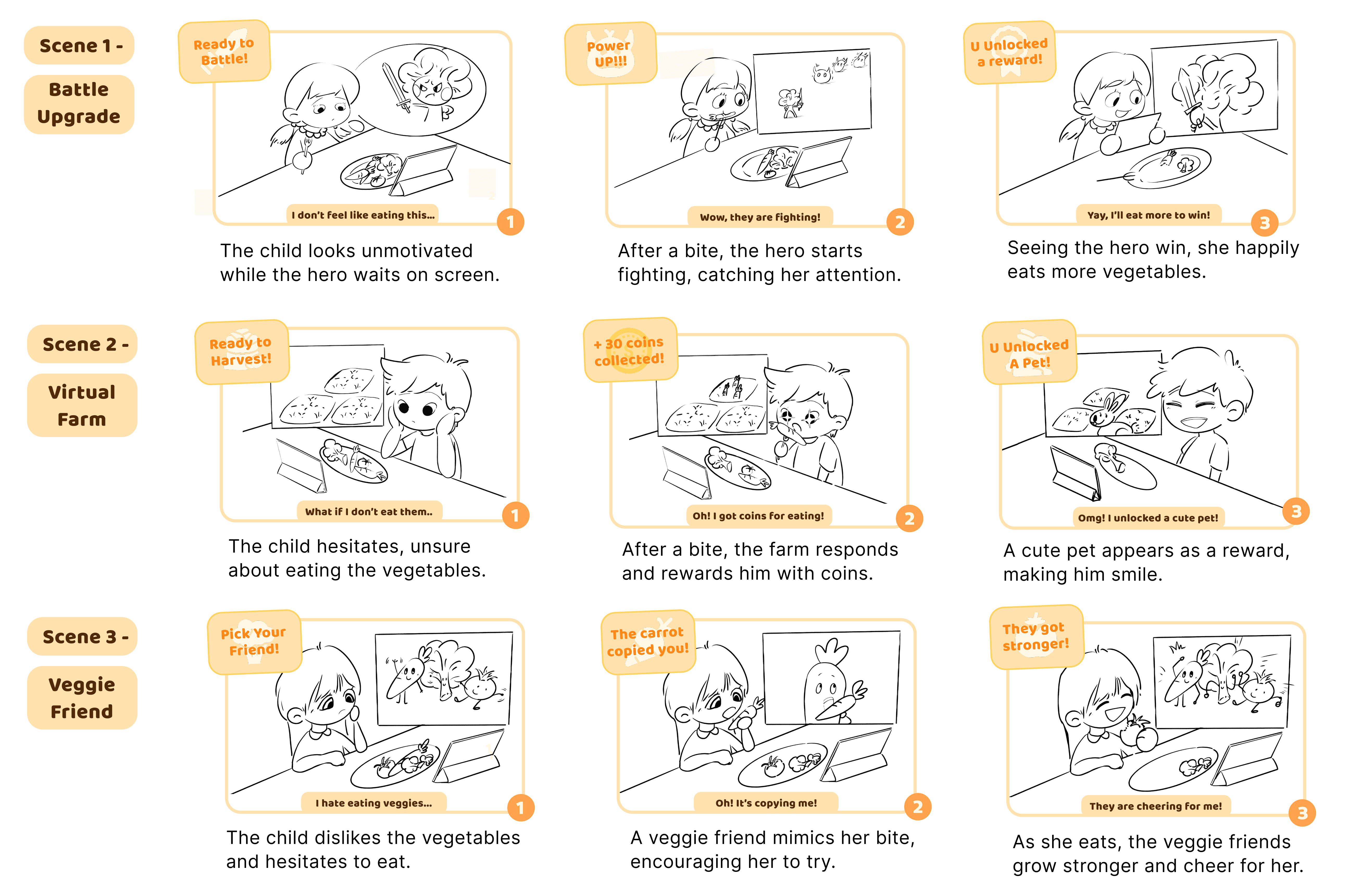 Based on this, the design will pair real eating actions with a simple growth-and-reward loop, supported by a friendly veggie companion that guides the experience.
