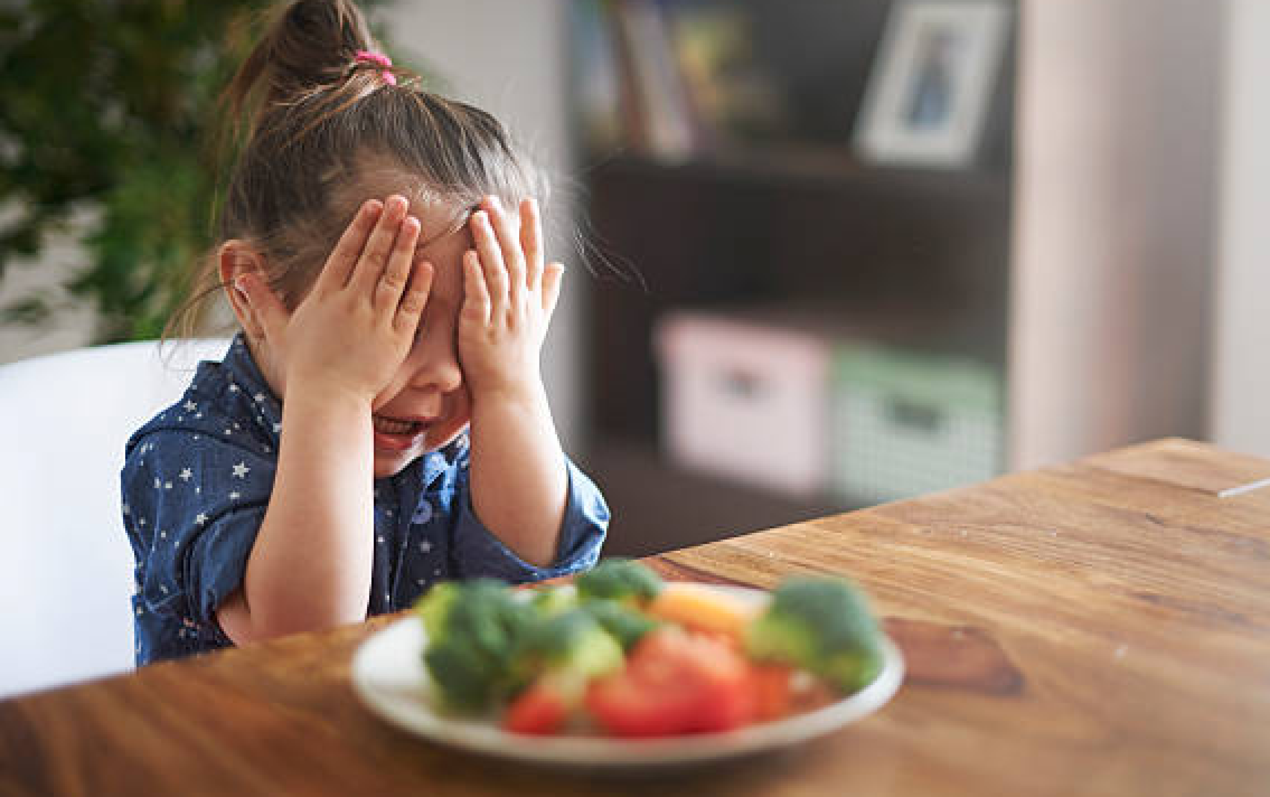 Cries, complains, or frowns when forced to eat veggies.