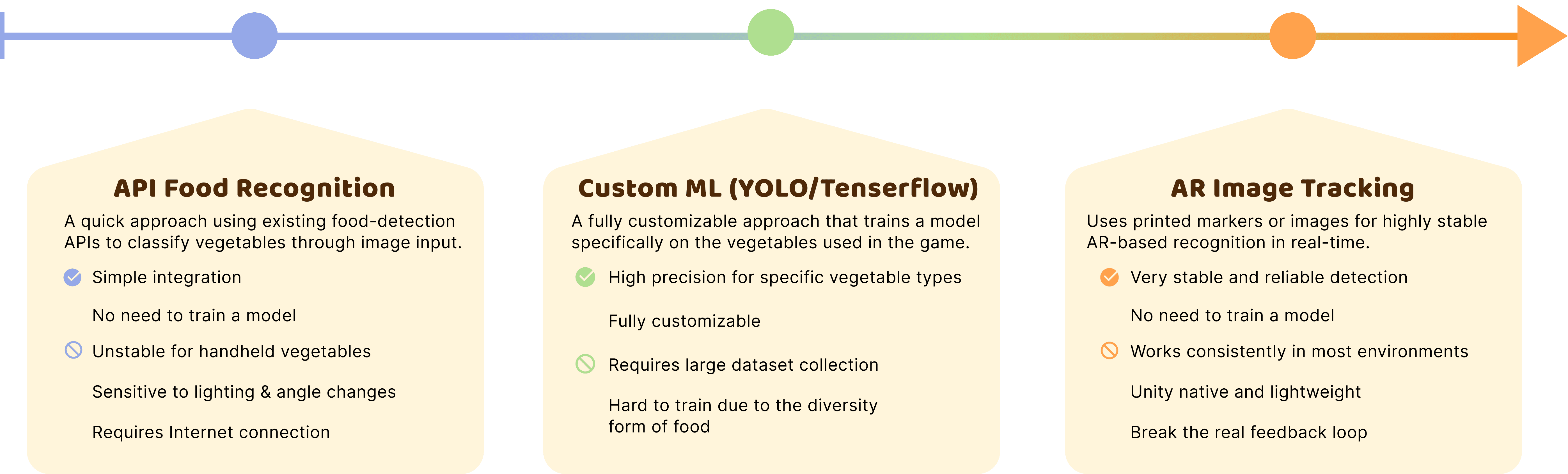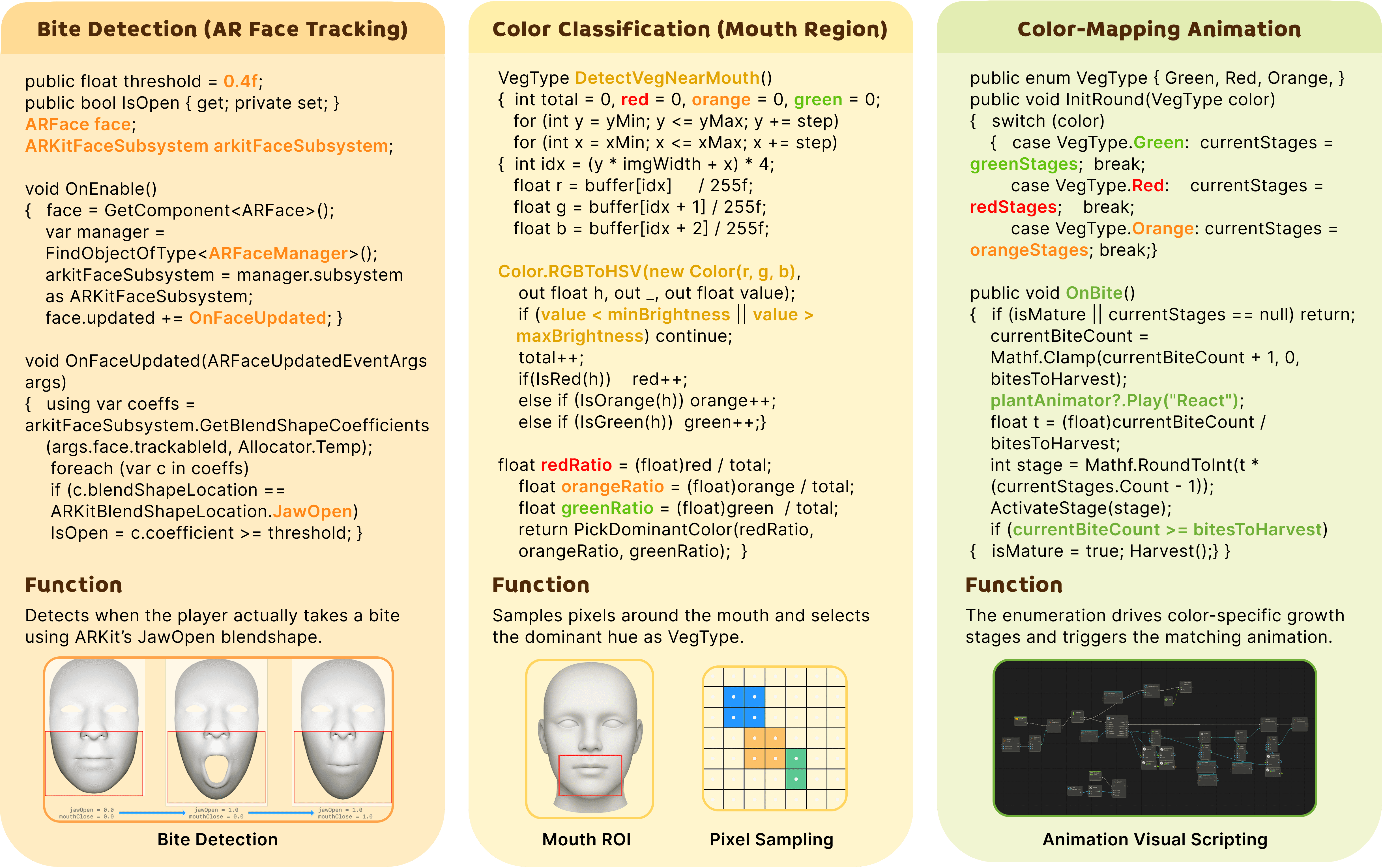 Finally, I adopted a color-based method by sampling the AR camera feed around the mouth and classifying the dominant hue in HSV. This runs fully offline, reacts instantly, stays stable under daily lighting, and still preserves the core interaction — “eat veggie → grow vegetables.”